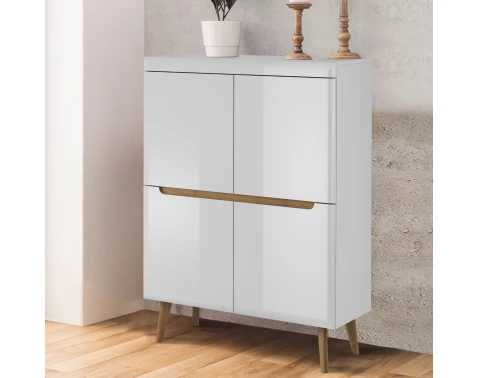 Úložná skříňka z kolekce Nordi - inspirujte se útulným severským stylem. Moderní nábytek v kombinaci dub/bílá lesk doplňují masivní dřevěné nožky.