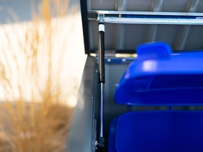 Kovový box na popelnice a zahradní nářadí 7×3 pojme až 3 velké nádoby na odpad (240 l) nebo poslouží jako univerzální úložný prostor. Je vyroben z pozinkovaného ocelového plechu, který je odolný proti vlhkosti, poškrábání i povětrnostním vlivům. Otevírání usnadňují plynové písty a široká křídlová vrata. Rozměry: 100 × 235 × 131 cm. Barva: tmavě šedá. Zakupte produkt Úložný box – Gerätebox 73 z kategorie Heureka.cz | Bydlení a doplňky | Bytové doplňky | Zahradní doplňky | Zahradní úložné boxy za cenu 8606.08 Kč.