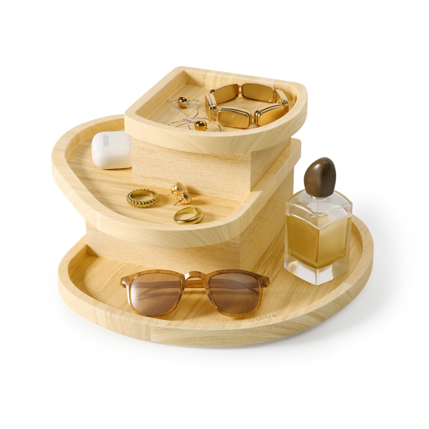 Umbra Cove je stylové a promyšlené řešení pro ukládání šperků a doplňků. Tři samostatné vrstvy s ukrytými přihrádkami pomáhají udržet vše přehledně uspořádané, chráněné a vždy snadno dostupné.