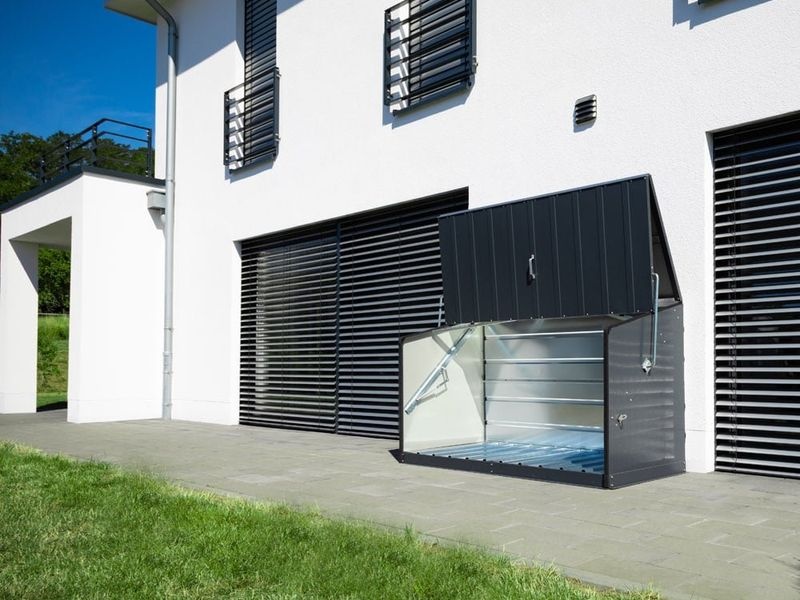 Kovový úložný box Storeguard v antracitové barvě poskytuje bezpečný prostor pro uskladnění zahradního vybavení či jízdních kol. Konstrukce z pozinkované oceli s PVC povrchem je odolná proti povětrnostním vlivům i ohni. Velká výklopná střecha se spánkovými pružinami zajišťuje snadné otevírání, nerezové spoje dodávají stabilitu a uzamykatelné body chrání obsah. Rozměry: 88 × 194 × 112 cm.