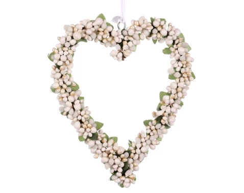 Umělý věnec ve tvaru srdce je ozdoben bobulemi v krémové barvě a stane se příjemnou podzimní dekorací, kterou lze zavěsit.