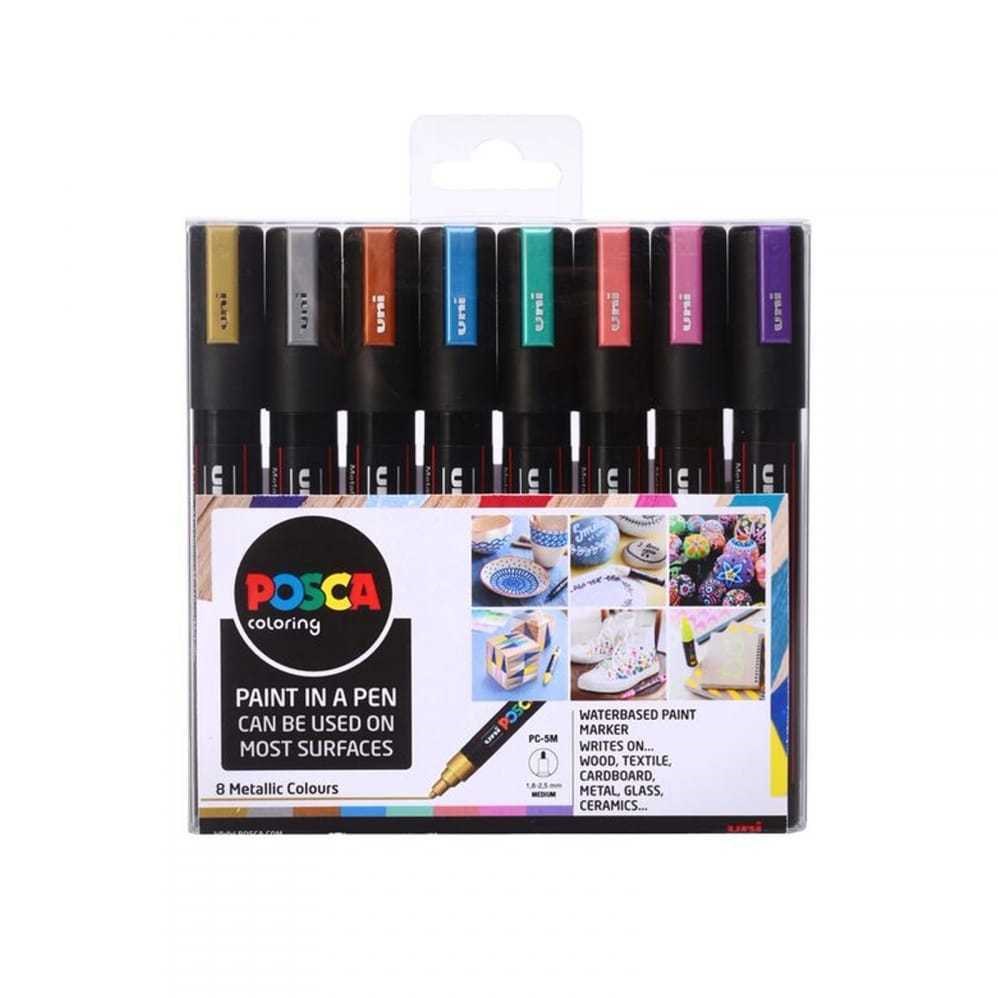 Špičkový popisovač s vysokou krycí schopností, na vodní bázi. Šířka hrotu je 2,5 mm PC-5M, nejoblíbenější varianta Posca penu. Popisovač je vhodný pro velké množství povrchů od papíru, přes keramiku, textil, sklo, kov, plasty... (V případě porcelánu se doporučuje zafixování v troubě na 160 st., v případě textílií je vhodné přežehlení z rubové strany, při aplikaci na další tvrdé povrchy, je možné také přelakování bezbarvým médiem). V eshopu jsou dostupné také kusové popisovače s velikostí hrotu PC-5M, PC-3M, PC-1M. Jedná se o výrobek z Japonska, kde patří mezi nejoblíbenější popisovače. Před použitím je třeba fixu protřepat, pohybem kuliček uvnitř dojde k aktivaci pigmentu a poté stlačit hrot o vodorovnou plochu, díky čemuž se do něj nasaje barva, poté je možné malovat běžným způsobem. V nabídce obchodu je možné vybrat velké množství dalších barevných variant. V sadě je 8 popisovačů v plastovém pouzdře, barva bronzová a červená, nelze koupit kusově, tudíž pouze v této sadě máte možnost tyto odstíny získat. Kromě bronzové a červené jsou v sadě také stříbrná, zlatá, zelená, fialová, růžová, modrá, všechny metalický odstín.