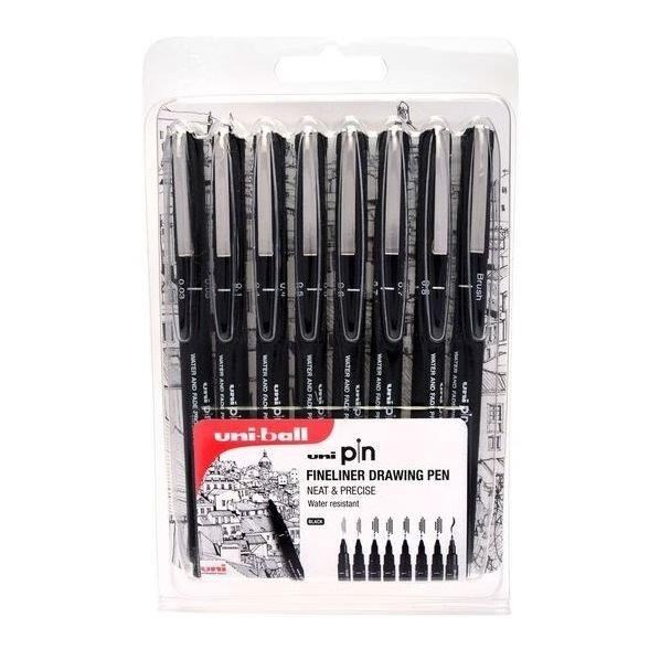 Sada obsahuje 7 linerů v černé barvě, plus jeden štětečkový (brush) popisovač. Šířka hrotů linerů je 0,03 mm, 0,1 mm, 0,4 mm, 0,5 mm, 0,6 mm, 0,7 mm, 0,8 mm. Hrot 0,03 mm je mimořádně vhodný pro drobnou a detailní práci. Sada se hodí pro skicování, náčrty, stínování, ale také technické kreslení. Hrot je uložen v ocelovém pouzdře, díky čemuž jsou linery vhodné při použití se šablonami. Inkoust je voděodolný a také vykazuje vysokou stálost vůči světlu. V nabídce jsou další sady linerů od značky Uni-ball (různé velikosti, v barvách černá, sépie a šedá). Linery jsou dodávané v plastovém pouzdře, v počtu 8 ks. Vyrobeno v Japonsku.