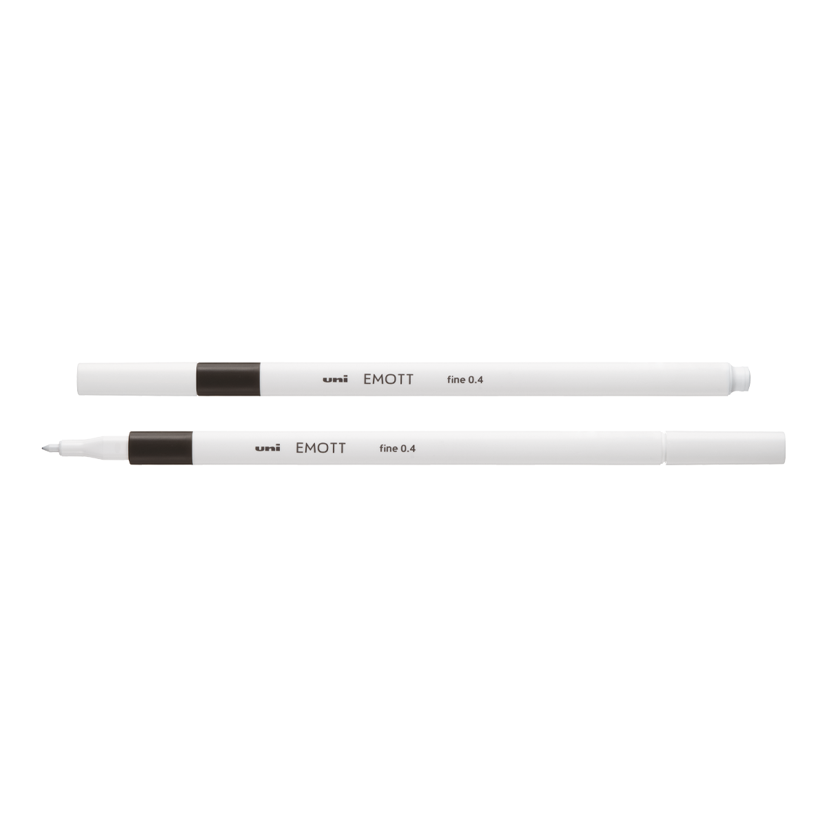 Uni Emott je exkluzivní, čistý liner s tělem bílým od "hlavy až k patě". Jemný, ultra odolný hrot, s ideální šířkou stopy 0,4 mm, se nekroutí, neštěpí a zajišťuje nepřetržitou šířku čáry bez ohledu na způsob použití.  Extra lehké psaní je další devizou těchto linerů. Vysoce kvalitní inkoust na bázi pigmentu a vody, nepropíjí se papírem, nestříká, nespouští.
