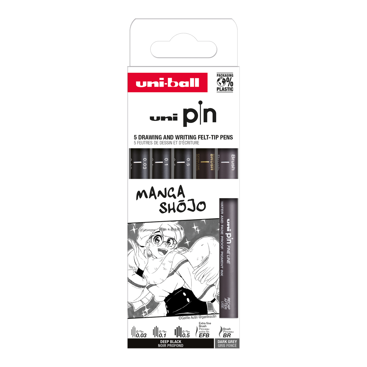 Sada kalibrovaných linerů s různými typy hrotů pro vykreslení obrysů, bublin, drobných a přesných detailů obličeje komiksového kreslení MANGA. Inspirujte se tvorbou Gaëlle AUTIN, @gaelleautin, která je autorkou kresby na přední straně. Pro více tipů a doporučení zkušených umělců naskenujte QR kód na zadní straně krabičky.3 × liner, šíře stopy: 0,03; 0,1; 0,5 mm1 × liner, extra tenký štětcový hrot (EFB)mix barev: černá, tmavě šedávíčko s kovovým klipemsvětlostálý a voděodolný inkoustvhodné pro: MANGA kresleníbalení: 5 ks krabička