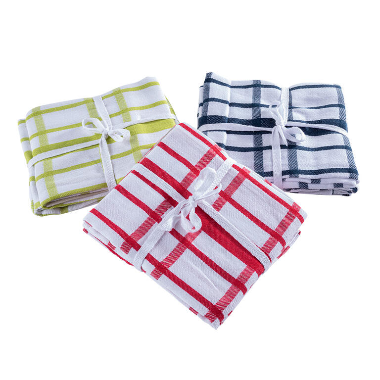 Velká sada žakárových kuchyňských utěrek z kvalitní egyptské bavlny s oblíbeným károvým dekorem ve 3 barevných provedeních. Pevné plátno nepouští vlákna, skvěle leští skleničky i suší mokré ruce. Opatřeno poutky na zavěšení.