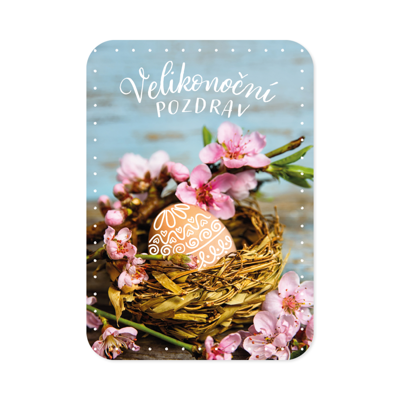 Velikonoční pohlednice s vajíčkem v košíku a textem velikonoční pozdrav. Zezadu věnování: Radostné svátky jara, čas plný pohody a štěstí přeje (...)
