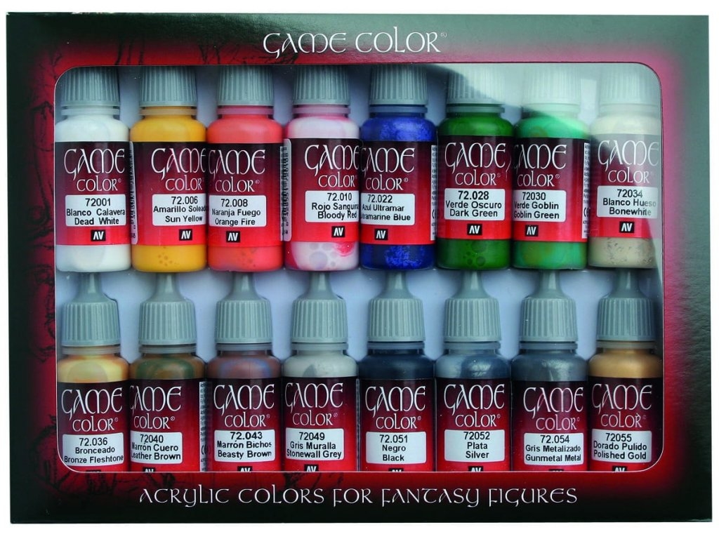 Sada šestnácti barev pro modely a miniatury. Akrylové barvy v matném a neprůhledném provedení na vodní bázi, speciálně navržené pro použití štětcem. Každá barva byla pečlivě vyvinuta ve spolupráci s malíři modelů, kteří se specializují na fantasy postavy a diorámy. Formulace těchto barev byla vyvinuta s přihlédnutím k tomu, že některé z těchto čísel se používají ve stolních hrách, takže Game Color je vyrobena z nové revoluční pryskyřice, která nabízí mimořádnou odolnost vůči poškození způsobenému častou manipulací. Doporučuje se nanést Game Color na dříve ošetřený povrch. Barvy rychle schnou a vytvářejí homogenní a samonivelační film při zachování i těch nejmenších detailů miniatury. Game Color představuje mimořádně obvyklé dodržování všech důvodů, jako je pryskyřice, plast, ocel a bílý kov. Malířské nástroje se čistí vodou. Game Color není hořlavý a neobsahuje rozpouštědla. Set of 16 Game Color references for painting models and miniatures. Contains 17 ml./0.57 fl.oz. bottles and a color chart. Content:72.001 Dead White72.006 Sun Yellow72.008 Orange Fire72.010 Bloody Red72.022 Ultramarine Blue72.028 Dark Green72.030 Goblin Green72.034 Bonewhite72.036 Bronze Fleshtone72.040 Leather Brown72.043 Beasty Brown72.049 Stonewall Grey72.051 Black72.052 Silver72.054 Gunmetal72.055 Polished Gold