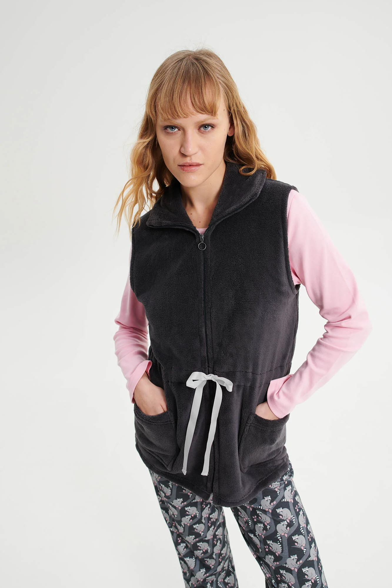 Vesta: 100% Polyester Coral Fleece Délka: 70 cm. Modelka: výška 175 cm, velikost: Small. Dámská vesta na zip, s límcem a nastavitelným páskem je vyrobena z tkaniny příjemné na dotek, která poskytne pohodlí a pocit elegance pro chvíle strávené doma.