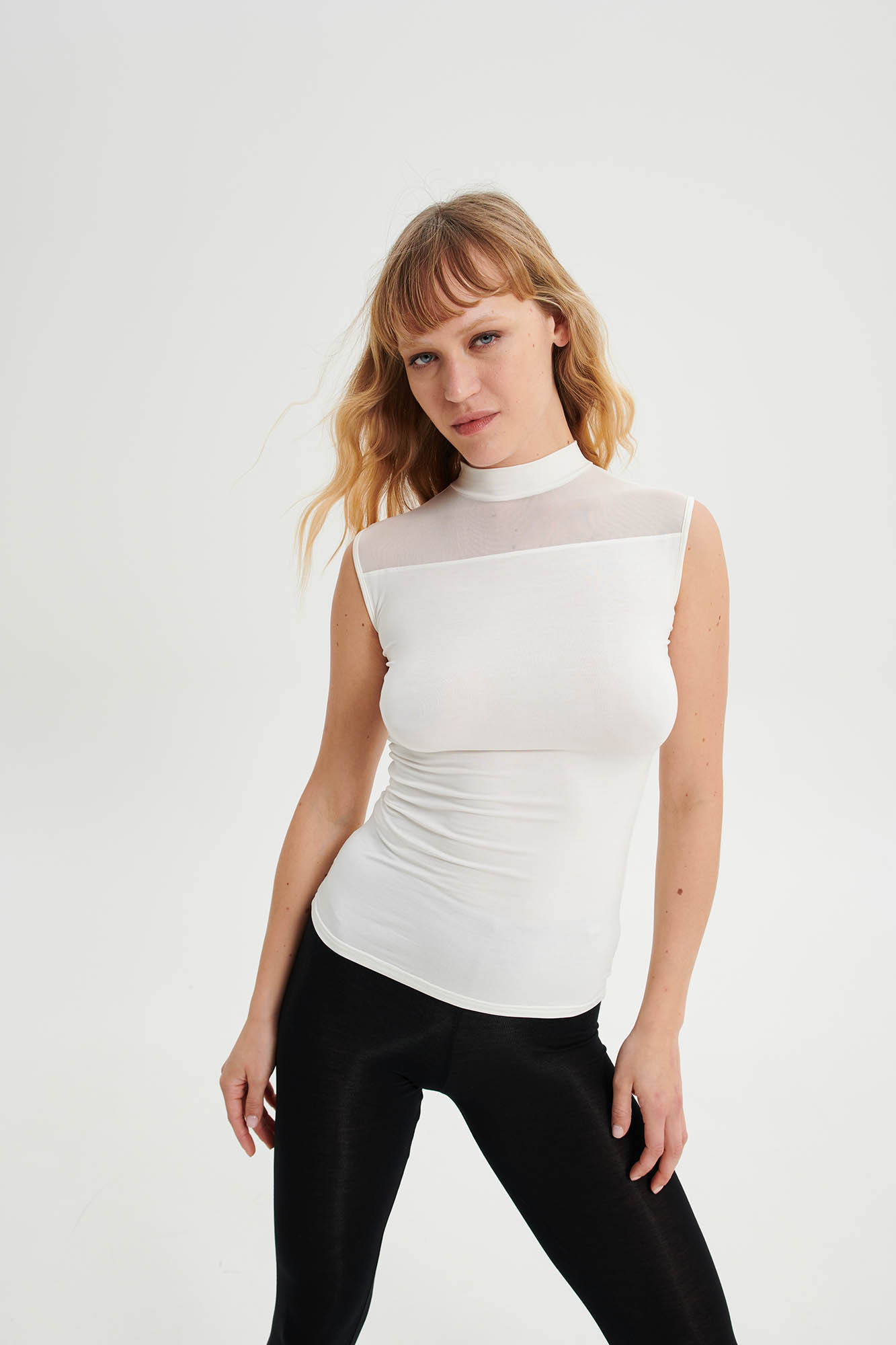 LENZING Tencel Modal Micro 93% + Elastan 7%. Délka: 60 cm. Modelka: výška 175 cm, velikost: Small.Dámská košilka bez rukávů, se síťovanými detaily a stojáčkem. Klasická hladká volba, která vám poskytne pohodlí a luxus.