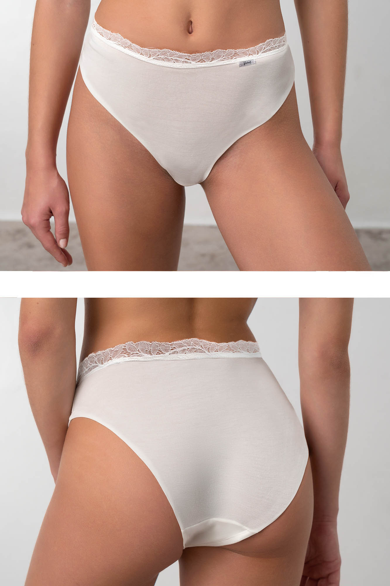 barva: black (černá), cream (krémová) materiál: S. Jersey, LENZING Tencel Modal Micro 93 %, Elastan 7 % střih: brief, vysoký pas, horní část kalhotek lemována krajkou modelka: výška 175 cm, velikost: Small (S)Příjemné dámské kalhotky s elegantní krajkou vyrobené z vysoce kvalitního Micro-Modalu s příměsí elastanu. Přírodní Micro-Modal (Tencel) poskytuje výjimečnou měkkost a pohodlí, je velice příjemný na dotek, prodyšný, při praní se nesráží, dobře absorbuje pot a rychle schne, zatímco elastan dodává oděvu potřebnou pružnost.