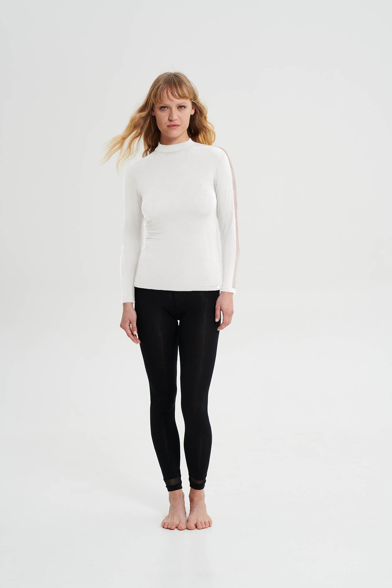 LENZING Tencel Modal Micro 93% + Elastan 7%.Délka: 60 cm.Modelka: výška 175 cm, velikost: Small.Dámská košilka s dlouhými rukávy a síťovanými detaily. Klasická hladká volba, která vám poskytne pohodlí a luxus.