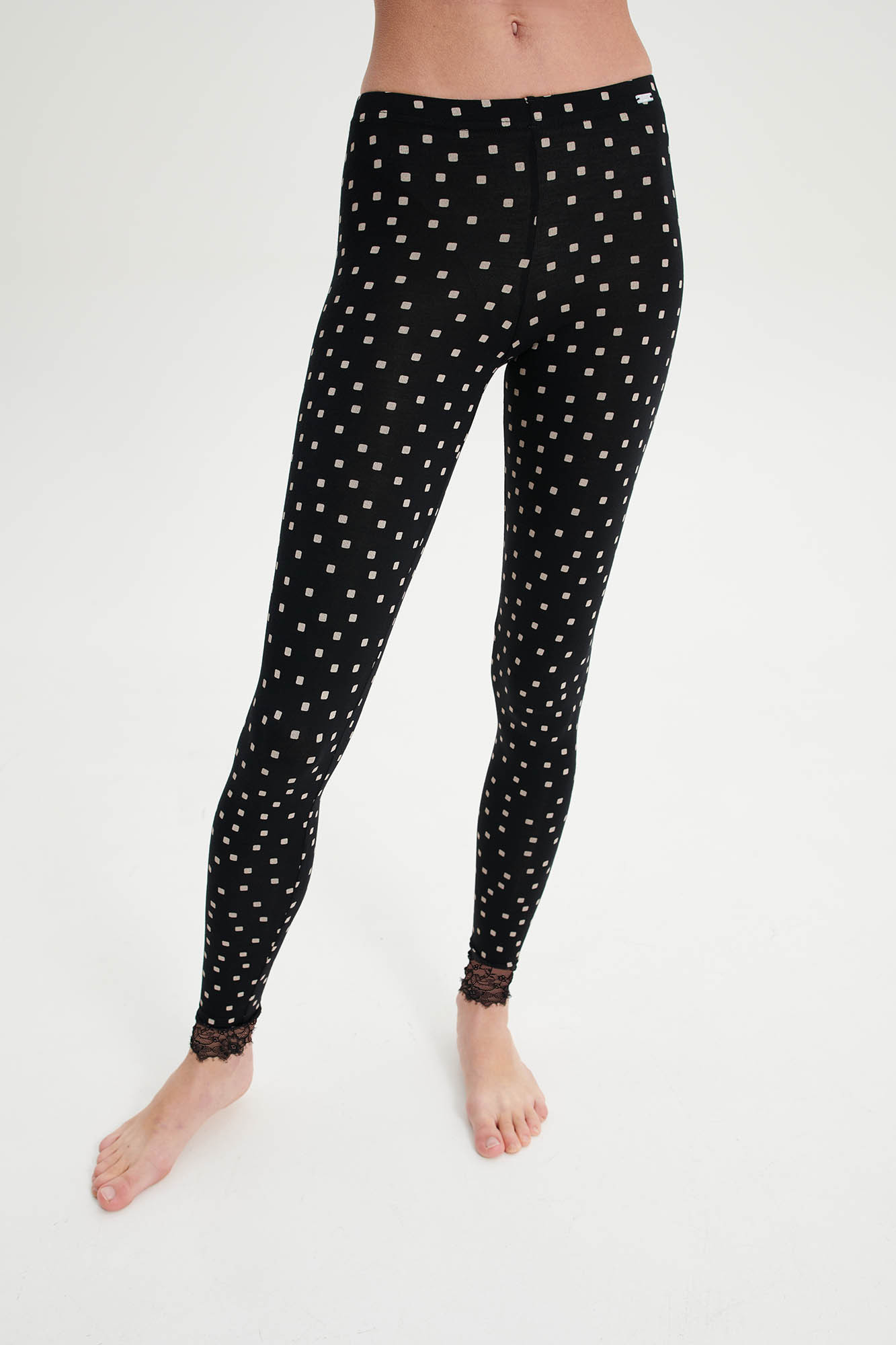 LENZING Tencel Modal Micro 93% + Elastan 7%. Modelka: výška 175 cm, velikost: Small.Legíny s potiskem, širokou gumou a krajkovým zakončením. Klasický návrh z materiálu příjemného na dotek, který vás bude těšit po dlouhá léta.