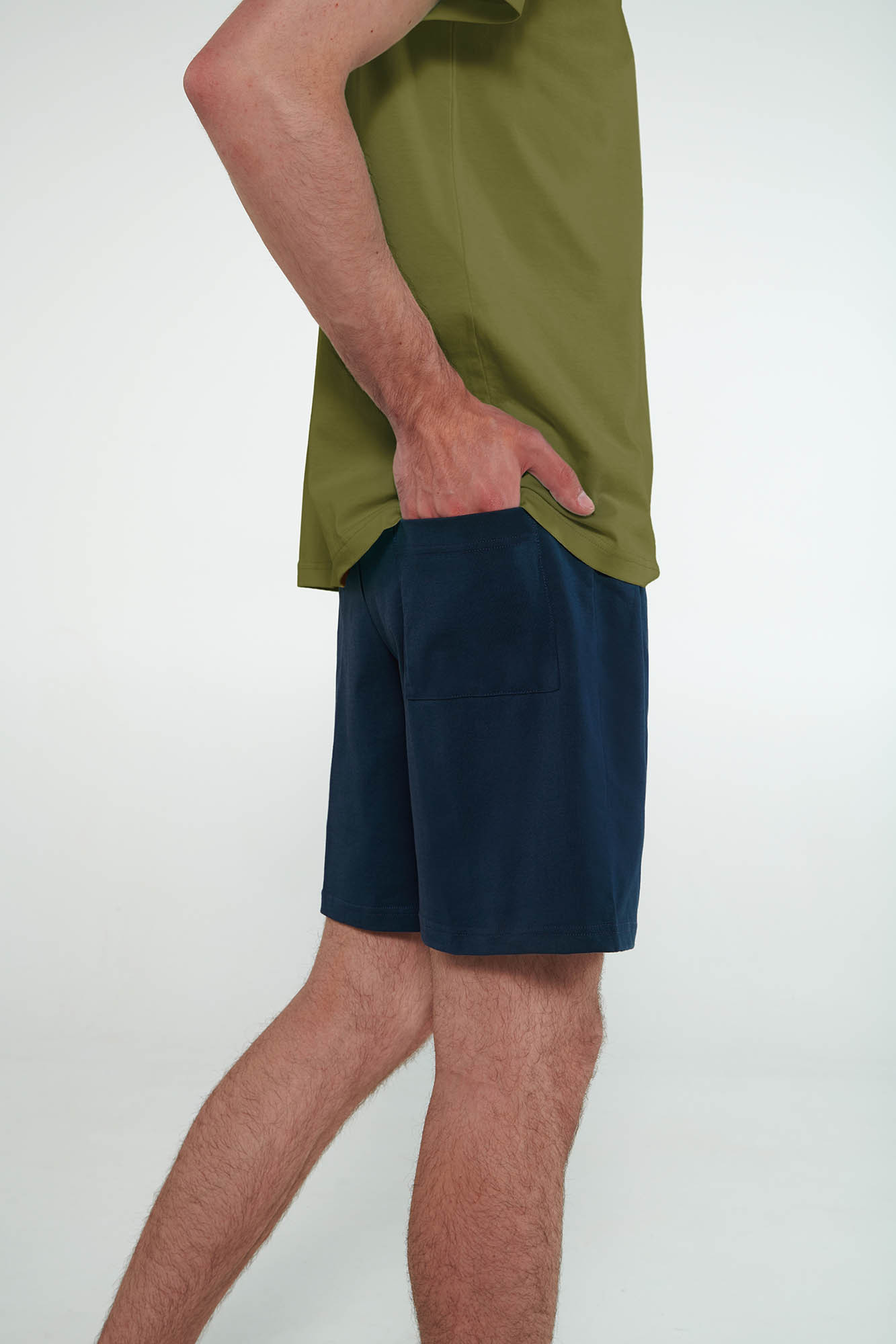100% Bavlna S. JerseyModel: výška 185 cm, velikost: Medium.Zachovejte si pohodlí a komfort v tomto letním pánském pyžamu. Souprava obsahuje hladké modré krátké kalhoty se zadní kapsou a odpovídající zelený top s krátkými rukávy a kulatým výstřihem. Tato souprava regular fit je vyrobena z jednoduchého žerzeje ze 100% bavlny a nabízí měkkost a prodyšnost, takže je ideální pro lenošení v teplých dnech nebo večerní odpočinek.