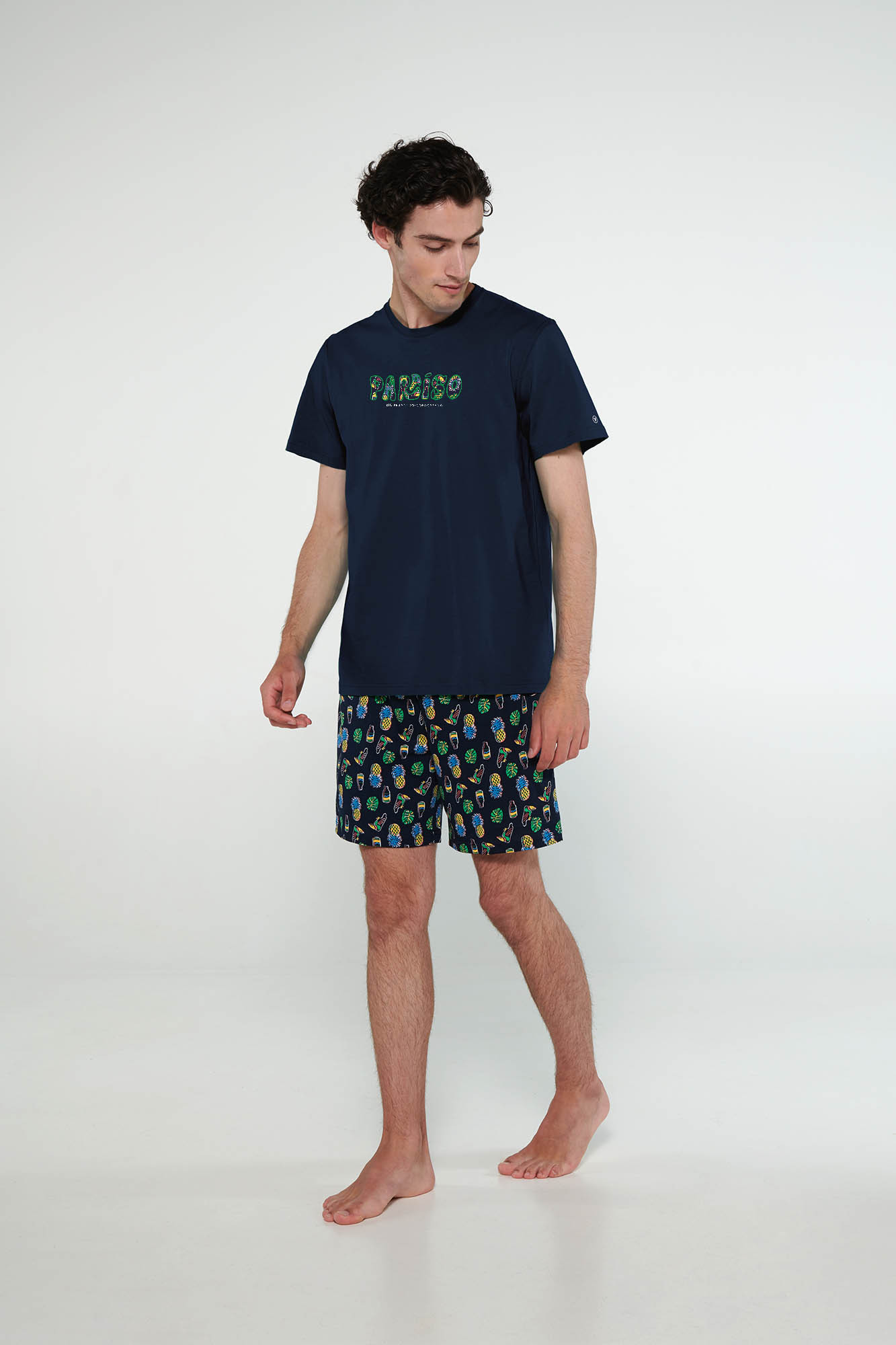 100% Bavlna S. JerseyModel: výška 185 cm, velikost: Medium.Pánské pyžamo s kulatým výstřihem a potiskem, krátké kalhoty. Svěží a chladivé, jak by měly letní dny vypadat.