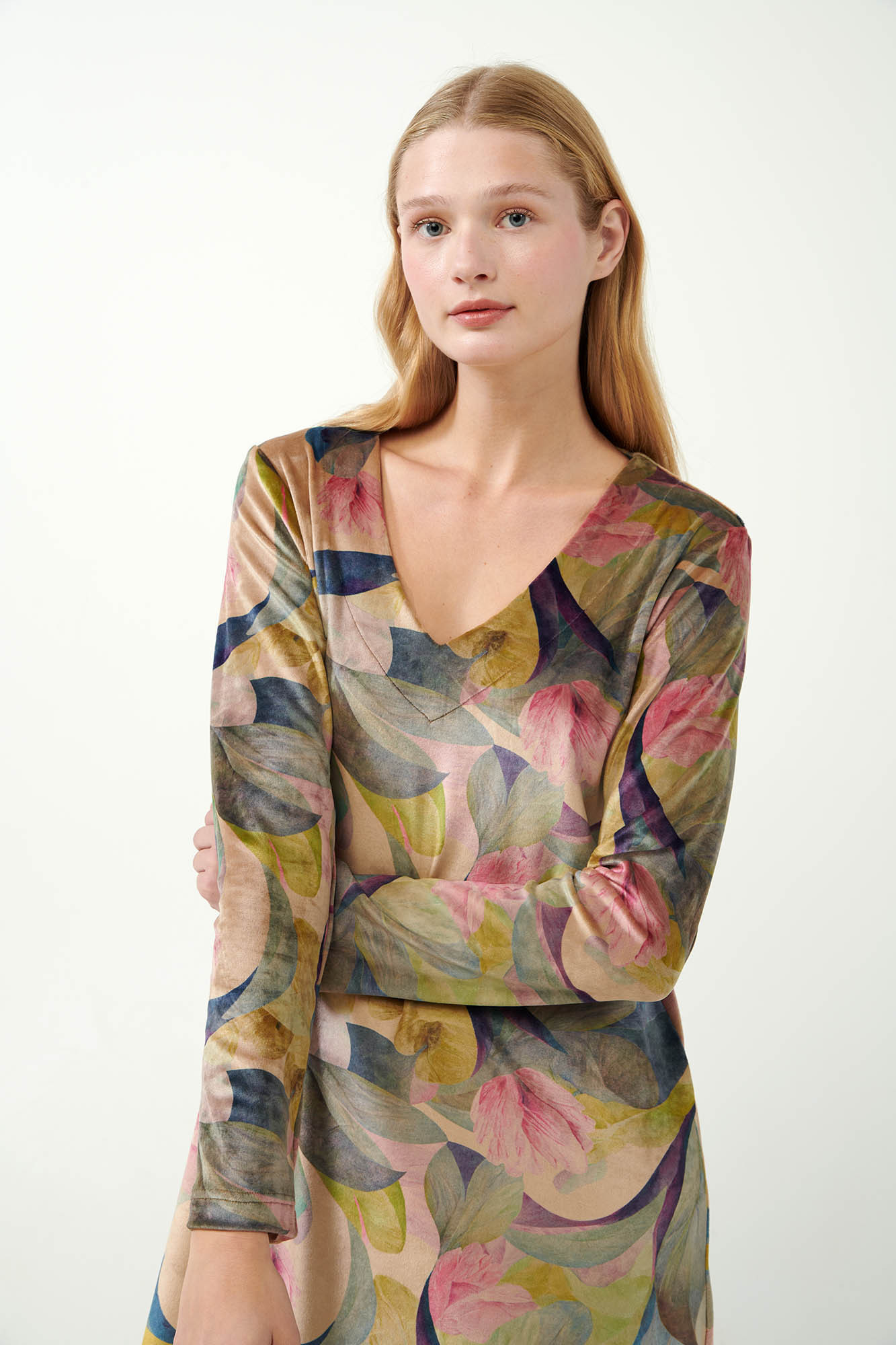 95% Polyester + 5% ElastanDélka: 125 cm.Modelka: výška 175 cm, velikost: Small.Tyto šaty z plyšového elastického veluru se zářivým květinovým potiskem protea nabízejí styl i pohodlí. Lichotivý výstřih ve tvaru písmene V umocňuje jejich ženský půvab, zatímco uvolněný střih zajišťuje lehkost a pohodlí po celý den. Tyto šaty, které se skvěle hodí na příležitostné lenošení nebo příjemný den doma, bez námahy kombinují luxusní měkkost s poutavým designem. Ať už odpočíváte, nebo si užíváte klidné chvíle, tyto šaty na lenošení jsou elegantní a pohodlnou volbou.