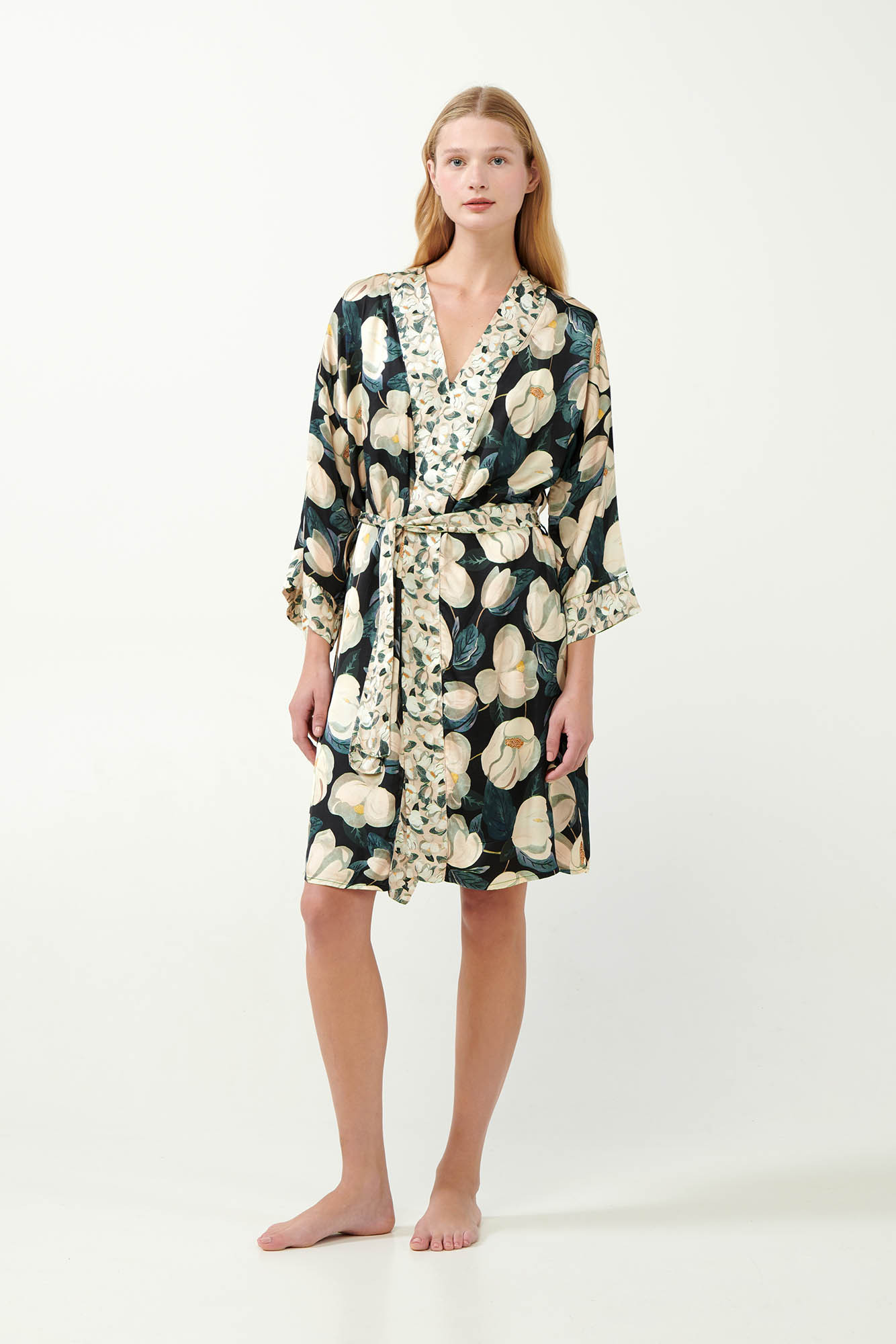 100% Viskóza SaténDélka: 100 cm.Modelka: výška 175 cm, velikost: Small.Tento dámský župan má úžasný potisk magnólie a nabízí dokonalou kombinaci elegance a pohodlí. Překřížený design s páskem zvýrazní vaši siluetu, zatímco uvolněné rukávy zajistí snadný pohyb. Tento župan je vyroben z luxusního viskózového saténu, který je na pokožce hladký a hedvábný, takže je ideální volbou pro stylové lenošení nebo vrstvení přes oblíbené noční oblečení. Krásný doplněk vašeho šatníku, který vnese do každodenní rutiny sofistikovanost i pohodlí.
