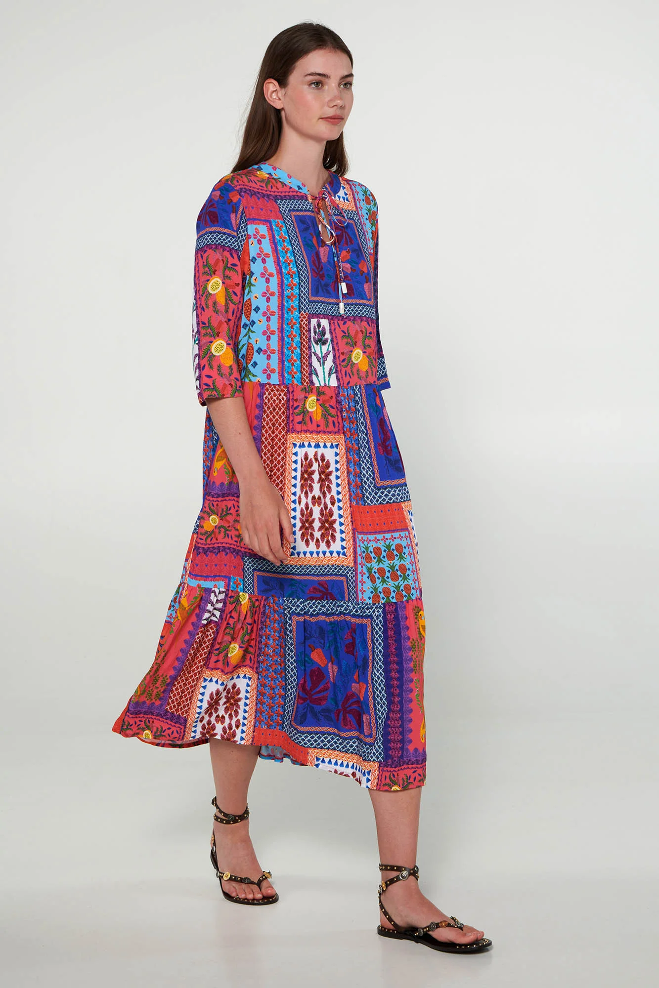 100% Popelín - Viskóza.Délka: 120 cm.Modelka: výška 175 cm, velikost: Small.Dlouhý kaftan s potiskem, výrazným výstřihem a krátkými rukávy. Dodají vám žádoucí svěžest pro začátek nového dne.