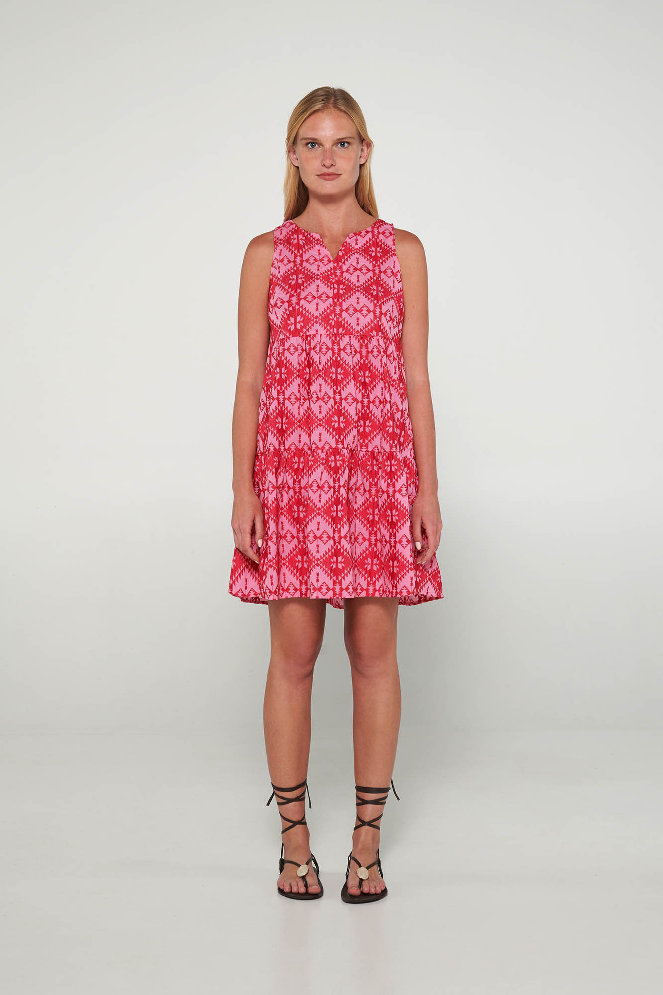 100% Bavlna - VoálDélka: 95 cm.Modelka: výška 175 cm, velikost: Small.Vyšívané šaty bez rukávů, s kulatým výstřihem a záhyby pro větší pohodlí. Ideální volba na letní dovolenou nebo do města.