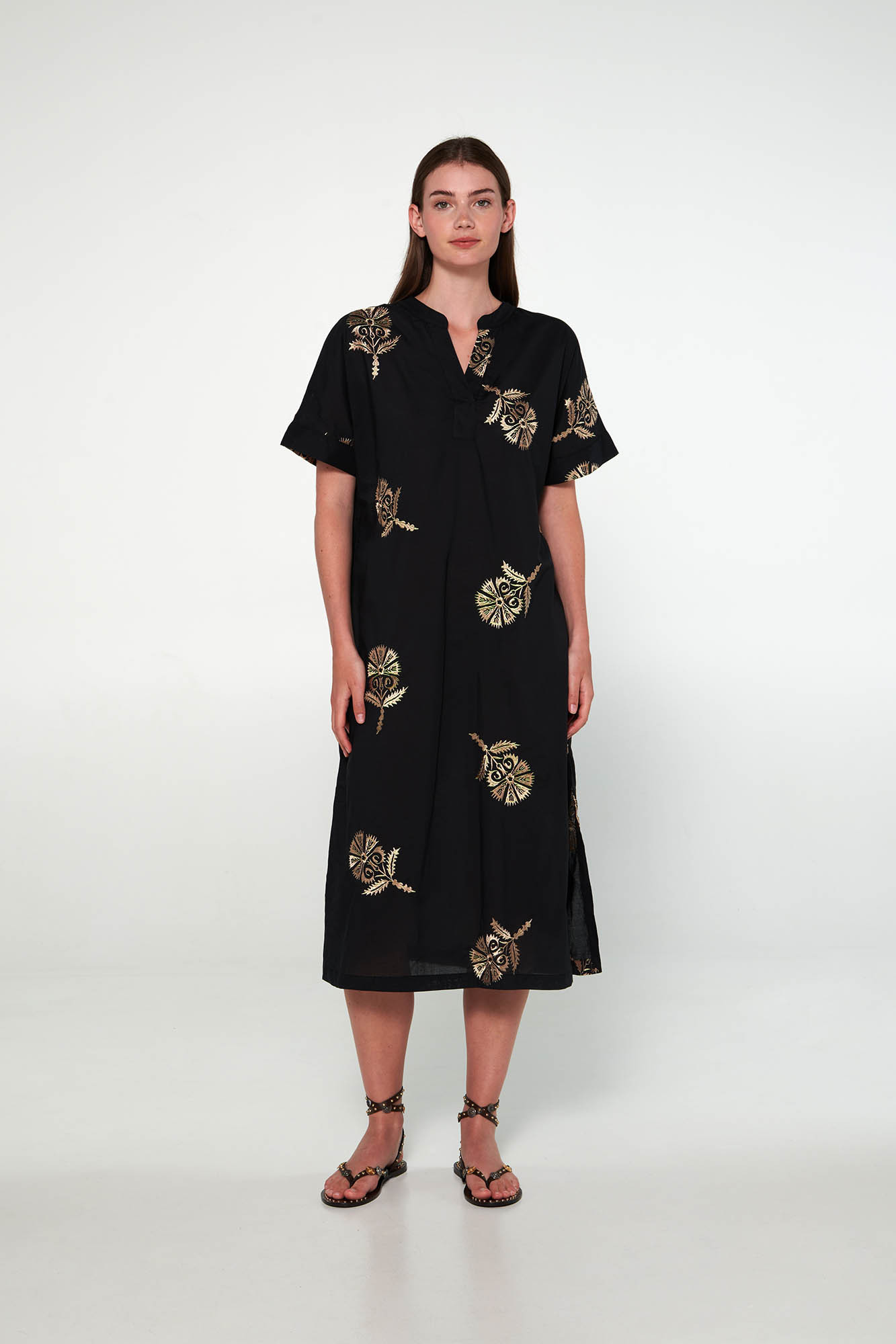 100% Bavlna - VoálDélka: 120 cm.Modelka: výška 175 cm, velikost: Small.Dlouhé šaty s krátkými rukávy a výraznou květinovou výšivkou. Jsou vyrobeny z bavlny příjemné na dotek a hodí se pro každou příležitost.