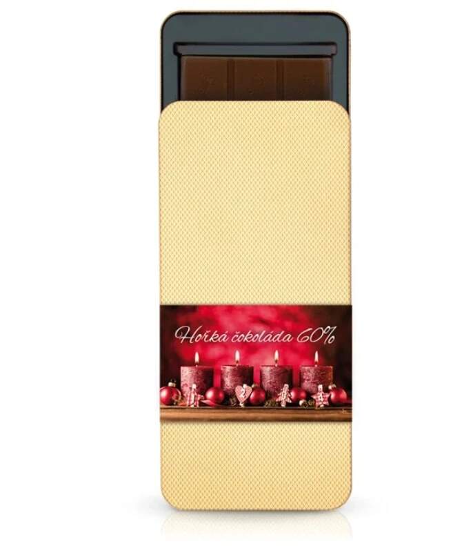Hořká čokoláda ve zlatém kovovém pouzdře s vánočním přebalem Složení: kakaová hmota (z Afriky, Severní a Jižní Ameriky), cukr, kakaové máslo, kakaový prášek se sníženým obsahem tuku, emulgátory: sójový lecitin, E476, přírodní aroma. Vysoký obsah železa a hořčíku. Obsah kakaové sušiny v hořké čokoládě min. 60%. Informace pro alergiky: Obsahuje sóju. Může obsahovat mléko, arašídy, ořechy a obilniny obsahující lepek. Čistá hmotnost: 100g. Skladujte na suchém místě, chraňte před teplem. Výživové údaje na 100 g energetická hodnota 2225 kJ / 535 kcal tuky 34 g z toho nasycených 22 g sacharidy 45 g z toho cukry 40 g bílkoviny 7,1 g sůl 0,1 g