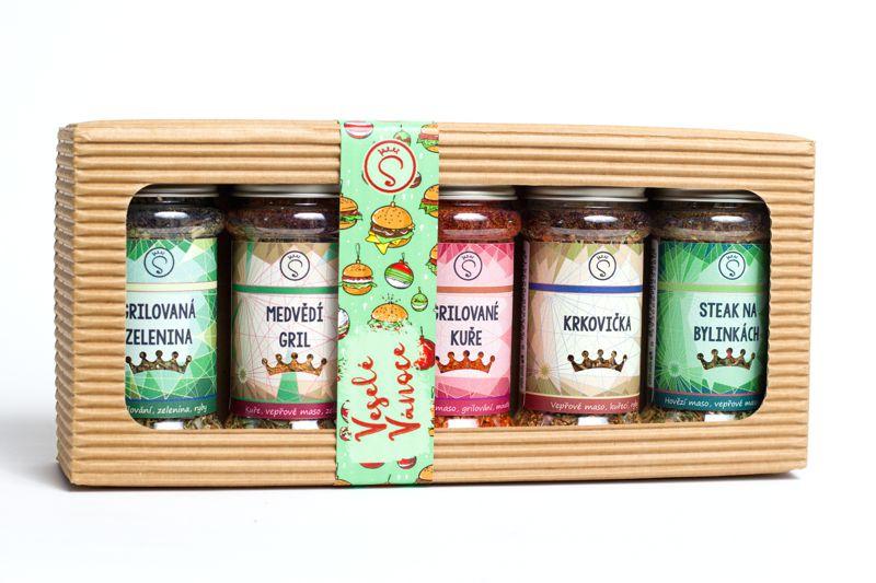 Sada koření na grilování a pečení hovězích steaků, kuřecích kousků i mletého masa. Nejoblíbější koření na maso, se kterým připraví výborné menu začátečník i profesionál. Ideální dárek pro všechny nadšence do grilování s rodinou a přáteli. Vánoční přebal Dárková sada obsahuje 80 ml kořenky: Medvědí gril - oblíbená grilovací směs s česnekem a medvědím česnekem. Nejlepší je na kuřecí maso, ryby nebo do mletých mas. Koření obsahuje bylinky, které nemají rádi dlouhé tepelné zpracování nebo přímý žár. Grilované kuře - klasické koření připravné z úžasné španělské papriky s úžasnou barvou. Kuřecímu masu dodá krásnou barvu, chuť i aroma. Steak na bylinkách- bylinkové koření jak na přípravu steaků z hovězího masa, tak do mletých mas. Nejlepší koření na přípravu masa do hamburgerů. Krkovička- koření na vepřové maso s česnekem, kmínem, pepřem a tyminánem. Jedinečnou marinádu na bůček připravíte z černého piva, oleje a koření Krkovička! Grilovaná zelenina - na hrubo drcené bylinky s trochou česneku a cibule je připravná na rychlou přípravu grilované zeleniny. Nejlepší zelenina na grilovaní je mladá cuketa, paprika, malá rajčátka, jarní cibulka, celý česnek nebo třeba patyzón.