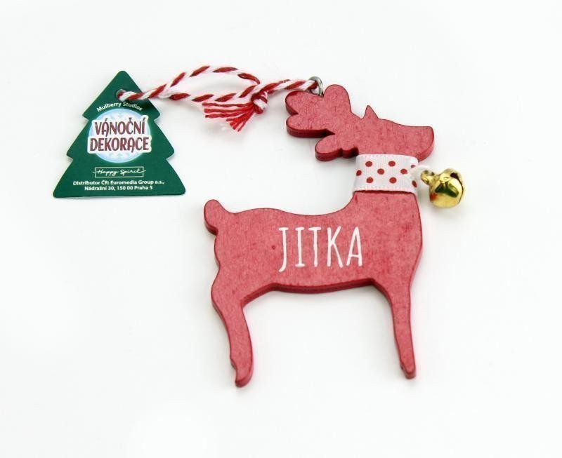 Dřevěné dekorace se jmény či texty lze použít nejen jako ozdobičku na stromeček, ale i jako stylovou jmenovku na dárek. S rolničkou a okrasnou stužkou. Sobíci pro ženy, bílí medvědi pro muže.