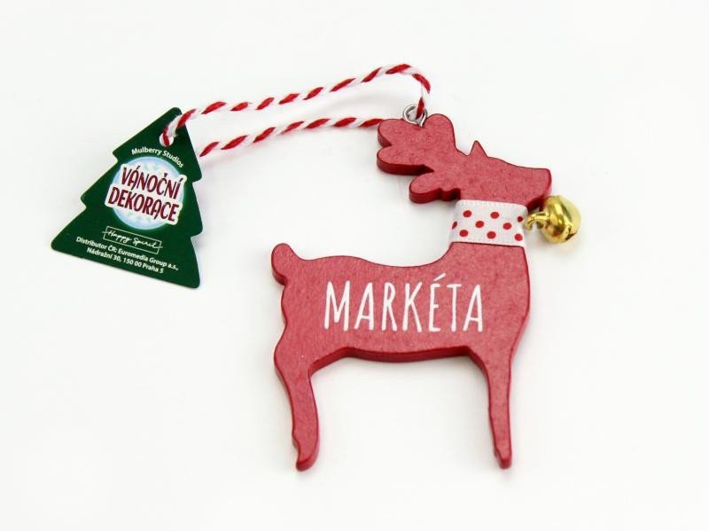 Dřevěné dekorace se jmény či texty lze použít nejen jako ozdobičku na stromeček, ale i jako stylovou jmenovku na dárek. S rolničkou a okrasnou stužkou. Sobíci pro ženy, bílí medvědi pro muže.