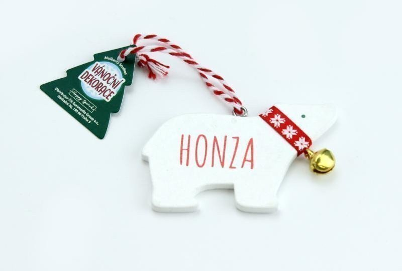 Dřevěné dekorace se jmény či texty lze použít nejen jako ozdobičku na stromeček, ale i jako stylovou jmenovku na dárek. S rolničkou a okrasnou stužkou. Sobíci pro ženy, bílí medvědi pro muže.