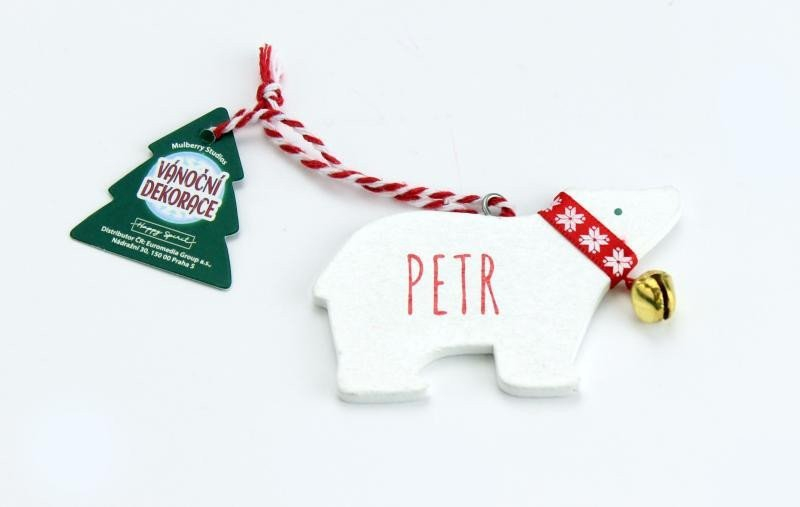 Dřevěné dekorace se jmény či texty lze použít nejen jako ozdobičku na stromeček, ale i jako stylovou jmenovku na dárek. S rolničkou a okrasnou stužkou. Sobíci pro ženy, bílí medvědi pro muže.