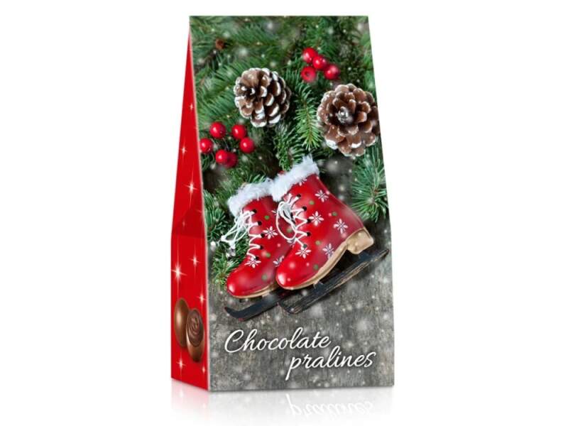 Italské pralinky ve vánočním balení s motivem zimních bruslí Čokoládové plněné pralinky s krémovou náplní v dárkové krabičce. Balení obsahuje pralinky s kakaovou, kávovou a lískooříškovou náplní. Náplň (60%): cukr, rostlinný tuk (palmový řepkový v různém poměru), odtučněný kakaový prášek 12%, sušená syrovátka, laktóza, odtučněné sušené mléko, emulgátor: sójový lecitin, vanilin, přírodní vanilkové aroma, káva 7% v kávové náplni, lískové oříšky 8% v lískooříškové náplni Skořápka (40%): cukr, plnotučné mléko 16,5%, kakaová hmota, kakaové máslo, sušená syrovátka, emulgátor: sójový lecitin, přírodní vanilkové aroma. Může obsahovat stopy ořechů a gluten. Informace pro alergiky: obsahuje syrovátku, laktózu, mléko, sóju, lískové ořechy, může obsahovat stopy ořechů a vajec. Čistá hmotnost: 100 g Vyrobeno v Itálii Uchovávejte v suchu, chraňte před teplem.