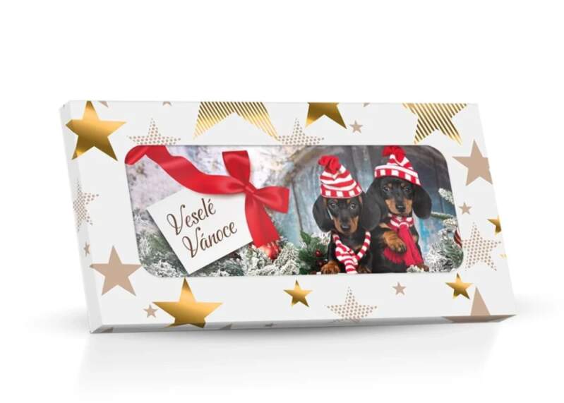 Mléčná čokoláda ve vánočním balení s motivem jezevčíků v čepici. Text: Veselé Vánoce Složení: cukr, kakaové máslo, sušené plnotučné mléko, kakaová hmota, sušené odstředěné mléko, sušená syrovátka (z mléka), emulgátor: sójový lecitin, přírodní aroma. Kakaová sušina: minimálně 31 %. Mléčná sušina: minimálně 19 %. Zdroj vápníku. Informace pro alergiky: Obsahuje mléko a sóju. Může obsahovat arašídy a ořechy a obilniny obsahující lepek. Čistá hmotnost: 50g. Skladujte na suchém místě, chraňte před teplem. Výživové údaje na 100 g energetická hodnota 2332 kJ / 554 kcal tuky 33 g z toho nasycených 21 g sacharidy 58 g z toho cukry 55 g bílkoviny 5,4 g sůl 0,34 g