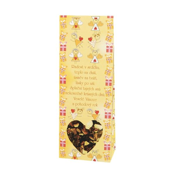 Ovocný čaj v dárkové krabičce s motivem rozkošných andílků Text: Radost v srdíčku, teplo na duši, úsměv na tváři, lásky po uši. Splnění tajných snů nekonečně krásných dnů. Veselé Vánoce a pohodový rok. Hmotnost 50g Země původu Česká republika 2 čajové lžičky zalijte 2,5 dl vroucí vody, ponechte 8 - 10 minut louhovat