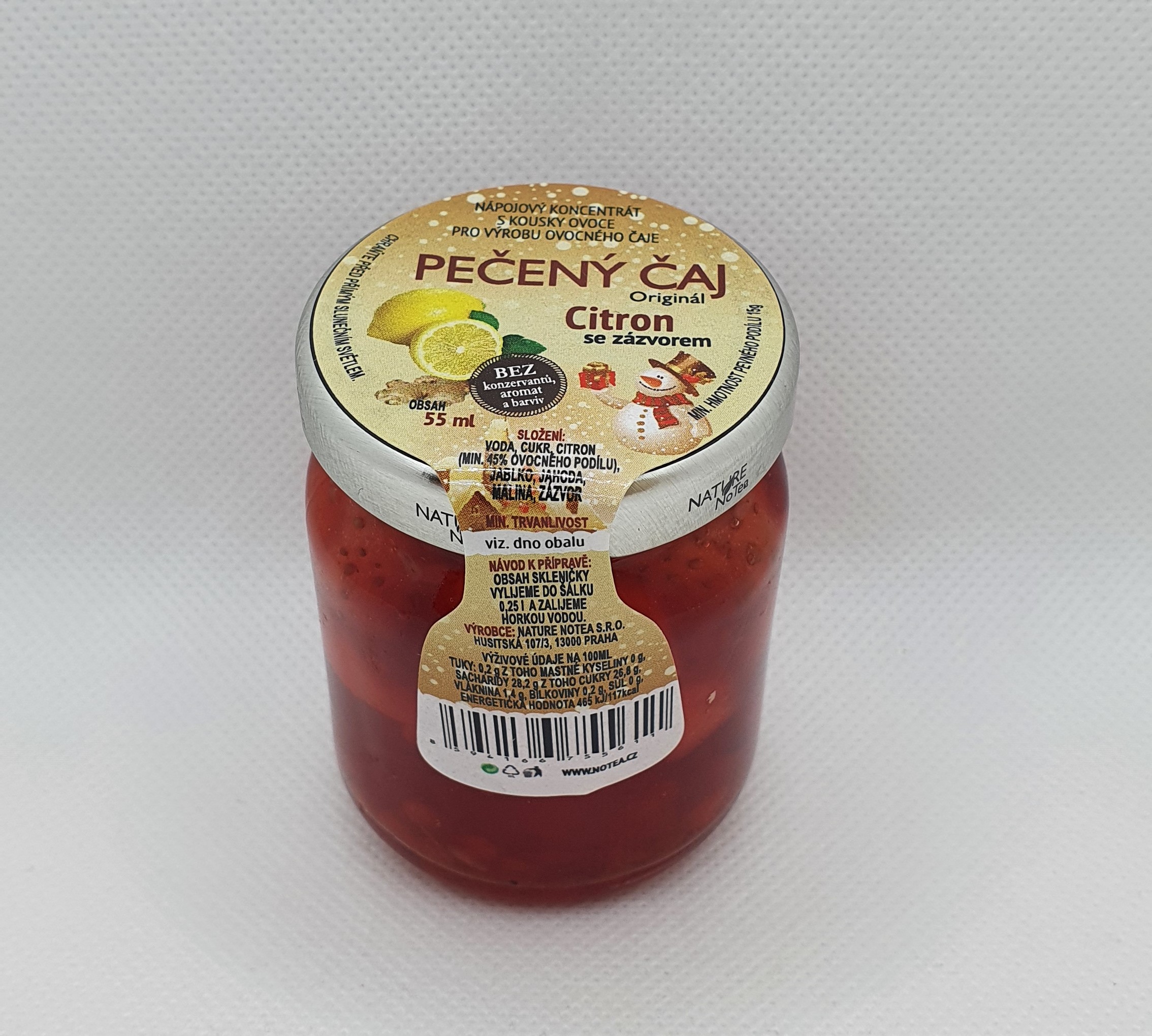 Vánoční pečený čaj citron se zázvorem 55ml Chuť opravdového ovoce v každé porci čaje doplňuje vybrané koření, které dodává ještě lepší požitek z pití.Pečené čaje jsou bezkofeinové - můžete si je tak užít se svými dětmi během celého dne! Návod k použití: Obsah lahvičky nalijte do připravené sklenice či hrnku a dle vaší momentální chuti zalít teplou či studenou vodou. Jednoporcové balení doporučujeme vylít do hrnečku o objemu 200 ml - 300 ml a zalít horkou vodou (min. 80°C) dle požadované chuti. Doporučuje vyzkoušet - ideální v létě:Pečené čaje zkuste zalít i vychlazenou perlivou nebo neperlivou vodou - vznikne tak osvěžující netradiční nápoj. Složení: voda, cukr, citron (min. 45 % ovocného podílu), jablko, jahoda, malina a zázvor. Nutriční hodnoty (100 ml): Energetická hodnota: 465 kJ / 117 kcalTuky: 0,2 g (z toho nasycené mastné kyseliny: 0 g)Sacharidy: 28,2 g (z toho cukry 26,8 g)Bílkoviny: 0,2 gVláknina: 1,4 gChlorid sodný (sůl): 0 g