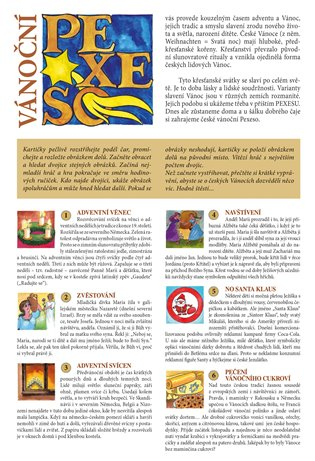 Jednotlivé obrázky a přiložené texty srozumitelně a jednoduše přibližují dětem pojmy, které jsou spojené s vánoční tématikou. Část obrázků představuje různé lidové i křesťanské symboly vánoc. Na dalších obrázcích jsou vyobrazeny výjevy a osoby, podle nichž se děti nenásilným způsobem seznamují s biblickým příběhem, který patří mezi základní zdroje evropské civilizace.