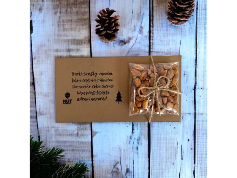 Směs ořechů v medu a soli na tvrdé kartičce s originálním přáním. Hezké svátky vánoční, bílou cestu k půlnoční. Do nového roku chceme Vám přát štěstí zdraví napořád. Rozměr 20 x 10,5 cm Mix ořechů v medu a soli 50g Složení: ARAŠÍDY 34%, cukr, KEŠU ořechy 17%, MANDLE 17%, glukóza, slunečnicový olej, emulgátor (E414), emulgátor (E322), slunečnicový lecitin, sůl, MED Země původu: Holandsko Výživové údaje 100g Energetická hodnota: 2351kj /565kcal Tuky: 37g z toho nasycené mastné kyseliny: 4,8g Sacharidy: 39,9g z toho cukry: 33,4g Bílkoviny: 15,9g Sůl: 0,55g