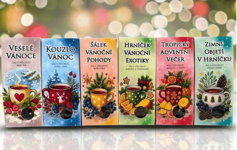 6 druhů Vánočního sypaného čaje v dárkových krabičkách. Druhy posíláme náhodný mix. Pokud potřebujete konkrétní druh čaje, pište prosím od poznámky v objednávce. Uděláme vše, abychom Vám vyšli vstříc. 6 příchutí, 6 příběhů. Hmotnost balení 40g 1. Veselé Vánoce – malina & jablko Jablko, aronie (30 %), květ ibišku (30 %), malina (5 %), aroma 2. Zimní objetí v hrníčku – černý rybíz & aronie Černý rybíz (40 %), květ ibišku (25 %), jablko (25 %), aronie, aroma 3. Šálek vánoční pohody – borůvka, aronie & bez Jablko, borůvky (20 %), aronie (20 %), květ ibišku (17 %), bez černý (12 %), aroma 4. Zasněžená lesní krajina – lesní směs devíti plodů a květů Bez černý (21,5 %), borůvka (15 %), aronie (14 %), jablko (13 %), hloh (10 %), květ ibišku (10 %), šípek (10 %), jeřabiny (5 %), aroma 5. Hrníček vánoční exotiky – mango, pomeranč & citron Mango (48 %), jablko, pomerančová kůra (4 %), koncentrovaná citronová šťáva (3,5 %), aroma 6. Tropický adventní večer – ananas, grep & ibišek Ananas (40 %), jablko, květ ibišku, koncentrovaná grepová šťáva (4,4 %), aroma