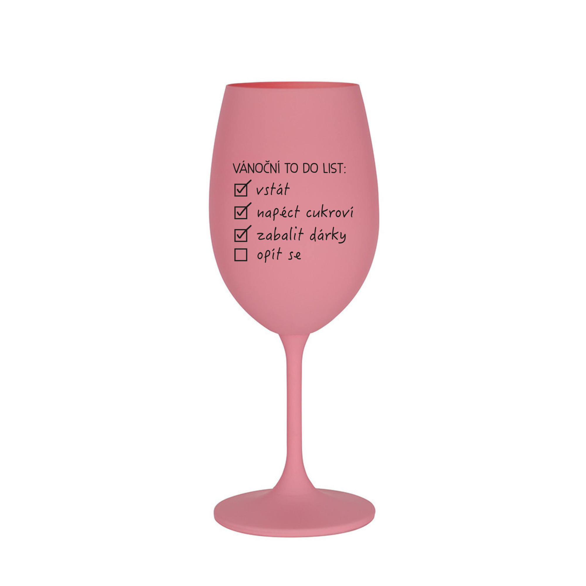Vinná růžová sklenice s originálním motivem VÁNOČNÍ TODO LIST je krásným a osobitým dárkem, které ale využijete i Vy sami třeba ve chvílích, kdy si budete chtít zpříjemnit náročný den. Tyto originální vinné sklenice jsou totiž nejen pro výjimečné události, ale i pro běžné večery, které si chcete zpříjemnit sklenkou dobrého vína. Jistě proto potěší každého milovníka vína, i toho, kdo si umí svůj život vychutnat plnými doušky. Materiál sklo. Vyrobené s láskou v ČR