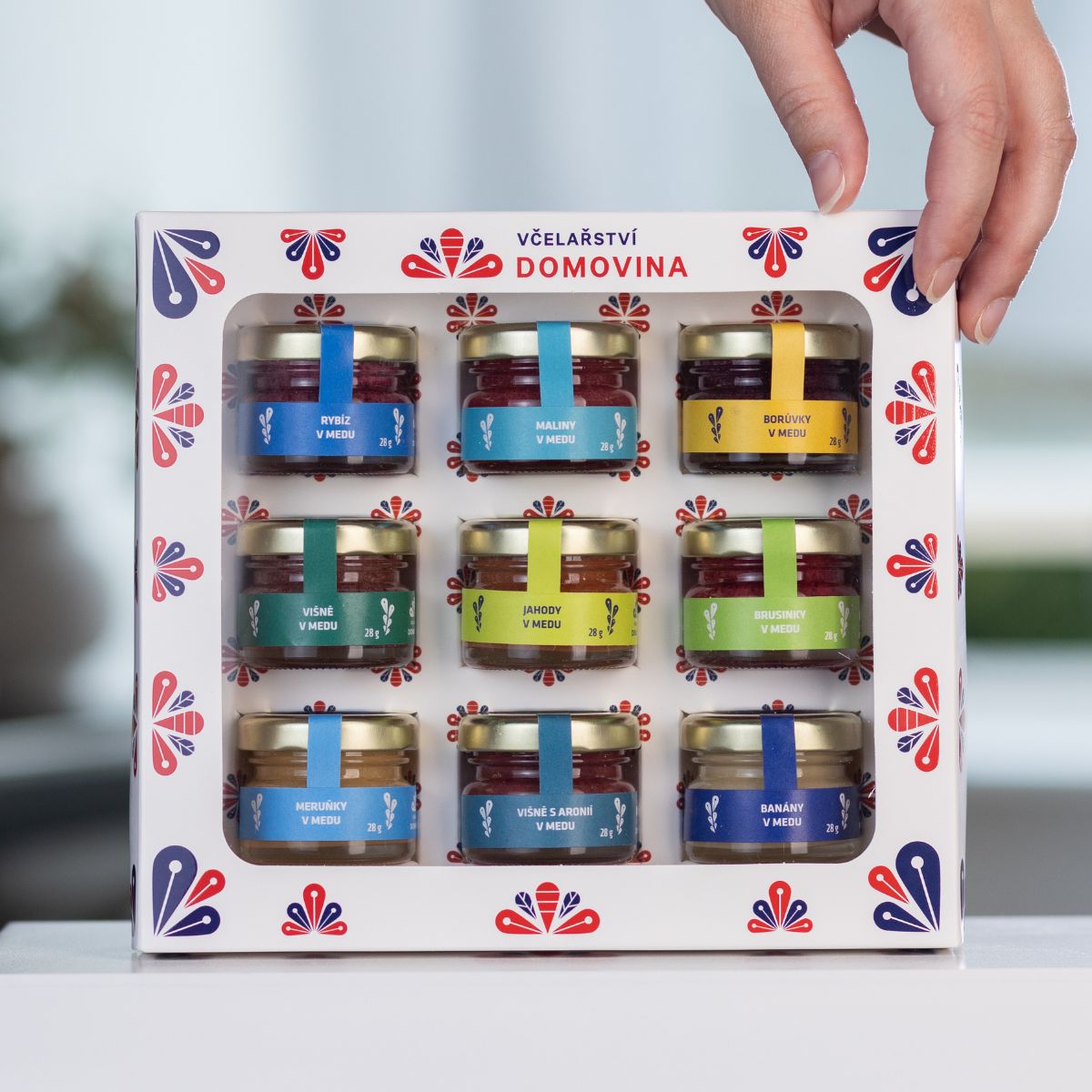 Do dárkové krabičky z papíru jsme zabalili 9 oblíbených, lahodných medů ze sady Ovocné mámení: