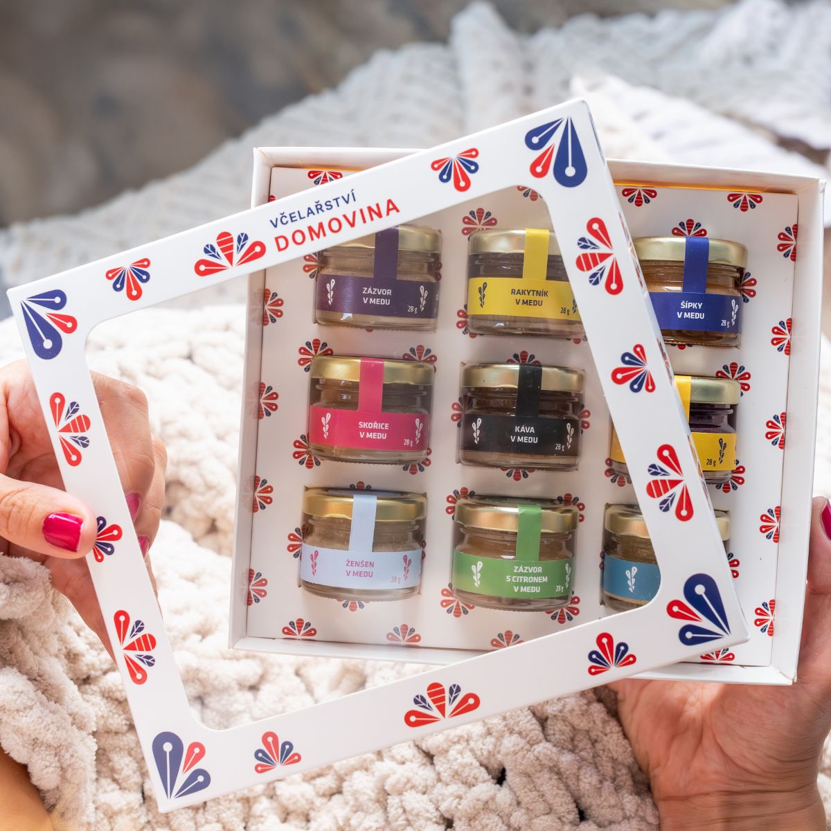 Do dárkové krabičky z papíru jsme zabalili 9 oblíbených, lahodných medů ze sady Zpátky do formy: