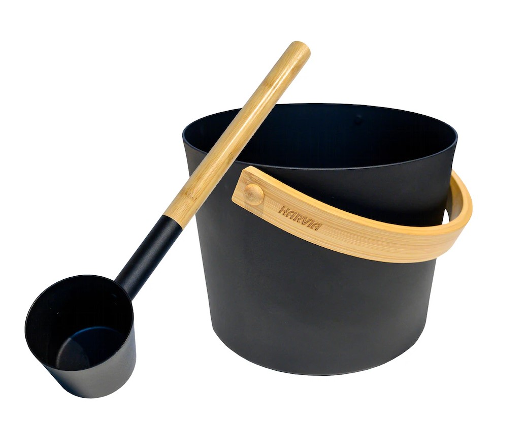Elegantní vědro do sauny je vyrobeno z nerezové oceli v kombinaci se dřevem. Moderní design s černou matnou povrchovou úpravou.