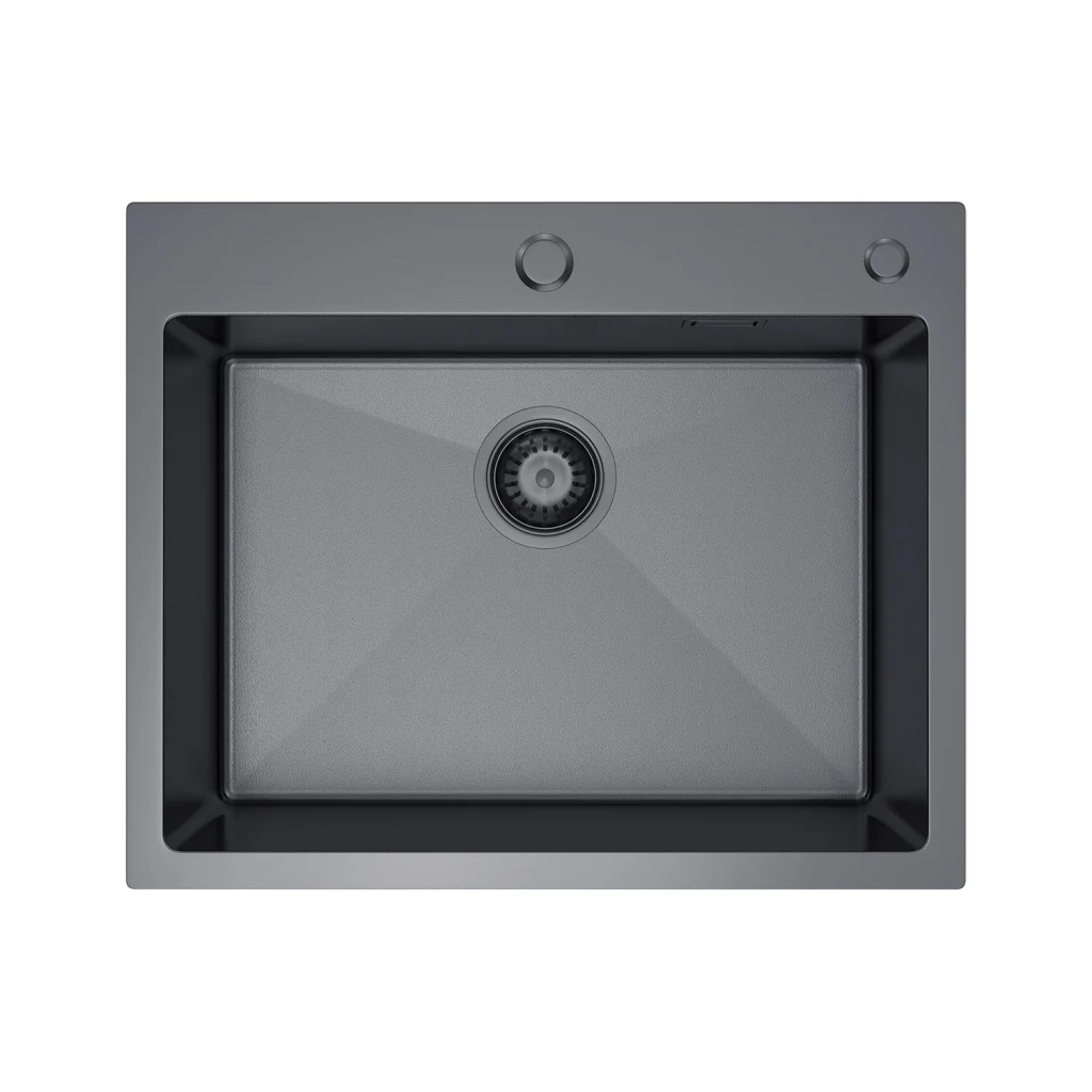 Typ montáže: zapuštěná do pracovní desky Materiál: nerezová ocel Povrchová úprava: VULKAN Barva: grafit Rozměry dřezu: 550 mm x 450 mm x 210 mm Rozměry mísy: 500 mm x 350 mm Tloušťka kovu: miska – 0,8 mm, okraj – 3 mm Otvor pro kohoutek: ano (35 mm / 28 mm) Přepadový otvor: ano