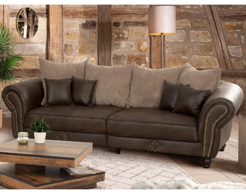 Velká pohovka v noblesním chesterfield stylu je velmi velmi oblíbená a zaujme na pohled. Komfortní polštáře v různých velikostech doplňují masivní tvarované nohy a okrasné kovové cvočky, které dotváří jedinečný vzhled. Tato široká pohovka je očalouněna kombinací hnědá látka ve vintage optice kůže a béžová látka s měkkoučkou strukturou.