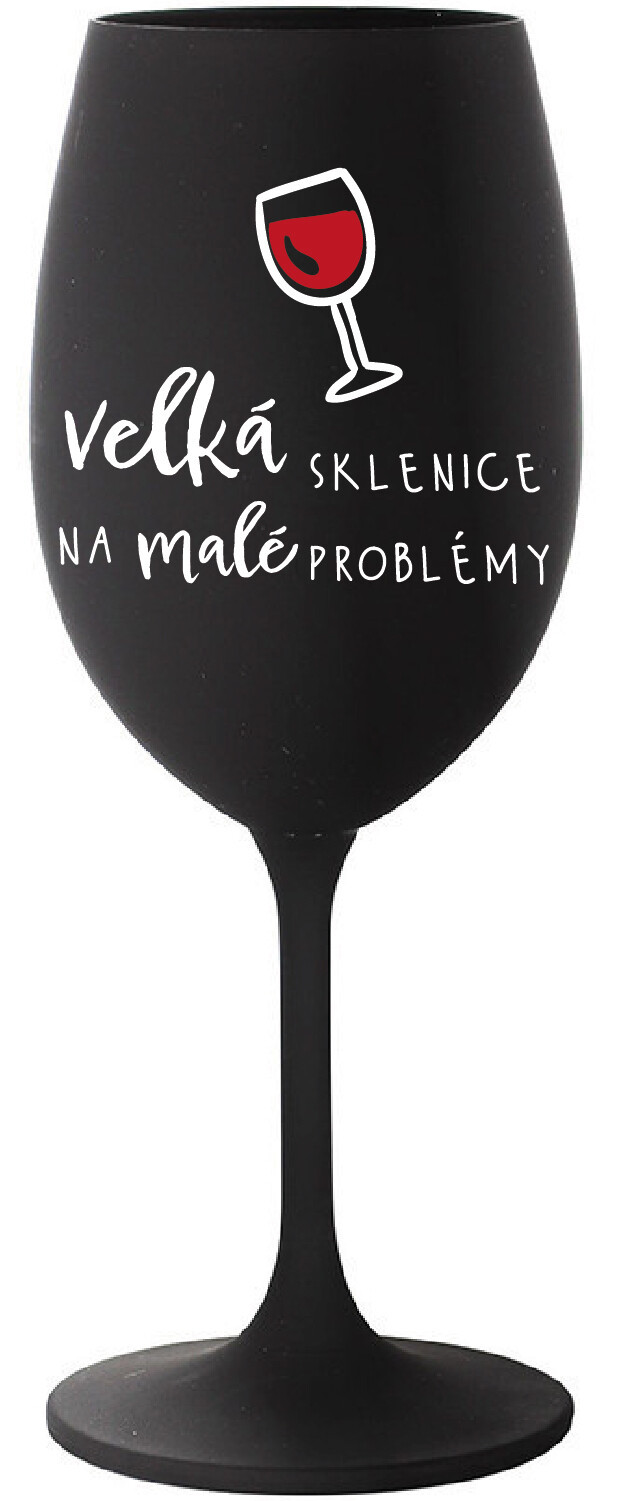 Vinná černá sklenice s originálním motivem VELKÁ SKLENICE NA MALÉ PROBLÉMY je krásným a osobitým dárkem, které ale využijete i Vy sami třeba ve chvílích, kdy si budete chtít zpříjemnit náročný den. Tyto originální vinné sklenice jsou totiž nejen pro výjimečné události, ale i pro běžné večery, které si chcete zpříjemnit sklenkou dobrého vína. Jistě proto potěší každého milovníka vína, i toho, kdo si umí svůj život vychutnat plnými doušky. Materiál sklo. Vyrobené s láskou v ČR