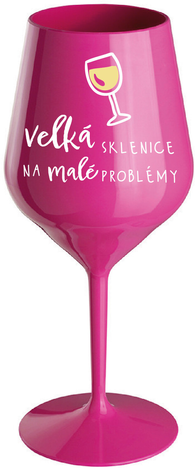 Nerozbitná růžová vinná sklenice s motivem VELKÁ SKLENICE NA MALÉ PROBLÉMY je skvělá na zahradu, pláž, výlet, piknik a parádu udělá i při kempování. Jelikož je vyrobená z kvalitního polykarbonátu je de facto nerozbitná. Je to luxusní kousek, s nímž si víno můžete vychutnat prostě kdekoliv. Mají ergonomický tvar, který příjemně padne do ruky a protože je lehká, usnadňuje to její přenášení. Je snadno skladovatelná a lehce se čistí. Díky svému designu si s ní můžete vychutnat doopravdy kdekoliv bezproblémové pití výborného vína. Materiál PP. Vyrobené s láskou v ČR