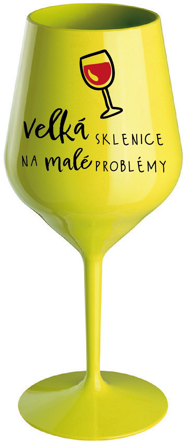 Nerozbitná žlutá vinná sklenice s motivem VELKÁ SKLENICE NA MALÉ PROBLÉMY je skvělá na zahradu, pláž, výlet, piknik a parádu udělá i při kempování. Jelikož je vyrobená z kvalitního polykarbonátu je de facto nerozbitná. Je to luxusní kousek, s nímž si víno můžete vychutnat prostě kdekoliv. Mají ergonomický tvar, který příjemně padne do ruky a protože je lehká, usnadňuje to její přenášení. Je snadno skladovatelná a lehce se čistí. Díky svému designu si s ní můžete vychutnat doopravdy kdekoliv bezproblémové pití výborného vína. Materiál PP. Vyrobené s láskou v ČR