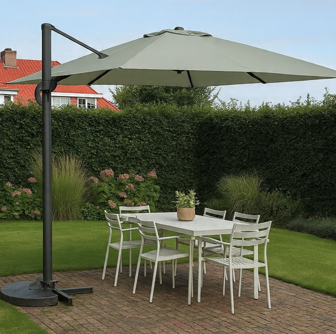 Užijte si pohodlí a stín v horkých letních dnech s moderním zahradním slunečníkem ROMA o průměru 300 cm. Tento velký slunečník s bočním ramenem kombinuje elegantní design, stabilní konstrukci a praktické vlastnosti, díky nimž je ideální volbou pro jakoukoli terasu, zahradu nebo venkovní posezení. Lehká, ale odolná hliníková konstrukce je navržena tak, aby odolala povětrnostním vlivům i při dlouhodobém používání. Osm robustních podpěrných ramen zajišťuje stabilitu i ve větru a díky konzolovému mechanismu je otevírání a zavírání slunečníku rychlé a snadné. Praktická možnost naklápění a otáčení umožňuje přesné nastavení stínítka podle pohybu slunce – bez nutnosti přemisťovat celou konstrukci. Slunečník má také křížovou základnu s možností zatížení betonovými dlaždicemi (nejsou součástí dodávky). Ať už si užíváte letní oběd na terase nebo relaxujete s knihou na zahradě, tento skládací hliníkový slunečník vám poskytne pohodlí, které oceníte. Specifikace: Průměr: 300 cm Výška: 250 cm Barva: khaki Typ: s bočním ramenem Tvar: čtverec Konstrukční materiál: hliník Materiál potahu: polyester 200 g/m² s UV ochranou 20+ Mechanismus: kbelík (manuální otevírání/zavírání), nastavitelný sklon a otáčení Počet ramen: 8 ocelových výztuh Podstavec: kovový kříž s pedálem (bez závaží) Hmotnost s obalem: 25 kg