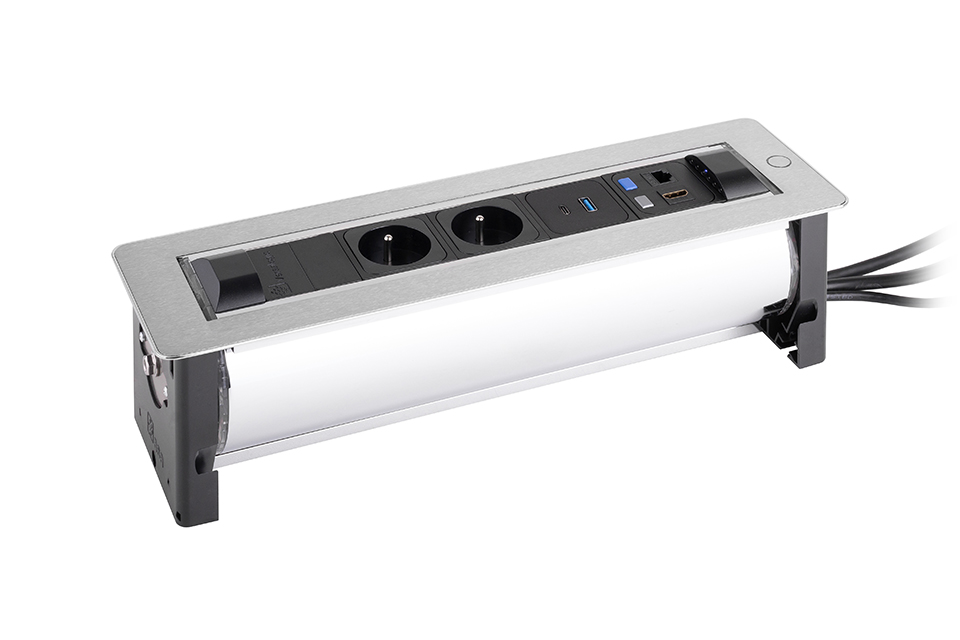 Versaturn je elektronicky řízená moderní designová zásuvka určená pro zabudování do stolů v kancelářích, zasedacích místností nebo hotelích.Versaturn je vybaven novým dotykovým snímačem pro ovládání otáčení.Povrchové úpravy v nerezi a ve skle dělají z Versaturn designový produkt určený pro náročné klienty.Stisknutím tlačítka se začne jednotka otáčet pomocí elektromotoru a zobrazí jinak ukryté přípojné body.Pro zajištění maximální bezpečnosti je Versaturn vybaven laserovým kontrolním systémem, který zabraňuje otáčení, když jsou zástrčky zapojeny, nebo v případě překážek.Parametry:- Napájecí kabel 2m- Velmi tiché otáčení pomocí elektromotoru- Detekce překážek- Vysoká kvalita zpracování.- AC 220 – 250V, 50Hz, 16A, 3400W USB A 5V, USB C 5V, 2.1A, 10.5W, HDMI, RJ45