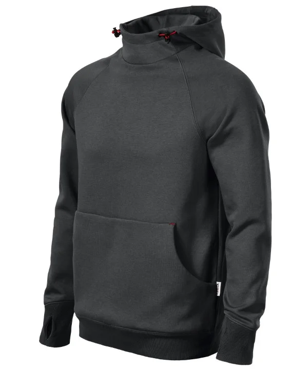rovný střih s bočními švy kapuce s podšívkou, na stažení elastickou šňůrkou vnitřní část průkrčníku začištěna kontrastní páskou raglánové rukávy s dvojitým prošitím nakládaná kapsa ve stylu klokanky 2 skryté kapsy na zip dolní lem a manžety rukávů z žebrového úpletu 2:2 s 5 % elastanu manžety s otvorem pro palec kontrastní prvky