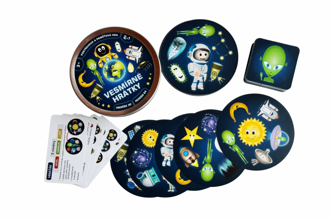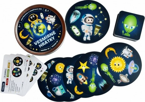 Zábavná karetní postřehová hra balená v malé plechové krabičce, to jsou Vesmírné hrátky, které obsahují 2 zábavné karetní hry: Hmaťáka a Pexeso. Děti si zábavnou formou zlepšují postřeh a paměť. Jednoduchá pravidla a krásně malované obrázky. Pro 2 a více hráčů. Vhodné pro děti od 3 let.